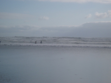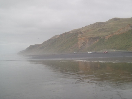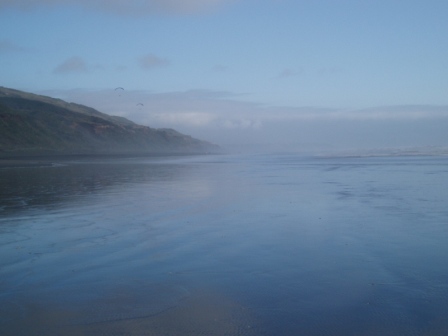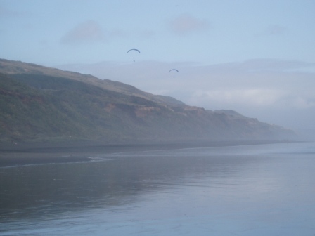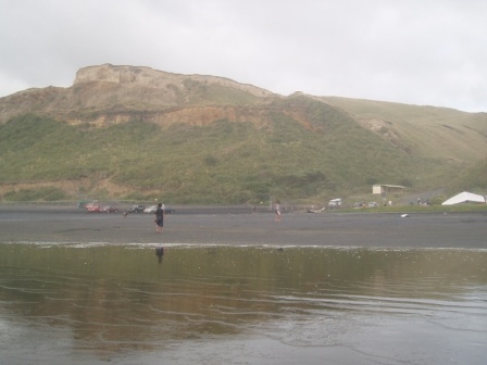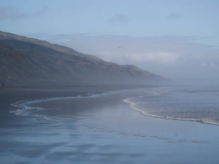 The west coast beaches were covered in black sand and the water temps were right around 15C, which, if you perform the standard conversion, you'll see is equivalent to the Fahrenheit reading of "really freakin' cold!!" The kiwis dove in but I was content to dip a foot and then go for a walk on the beach. There were a number of teenagers doing donuts on the sand, but in between dodging their speeding cars, I was able to admire the amazing cliffs that lined the shore and the fleet of hangliders and parachuters that filled the air.