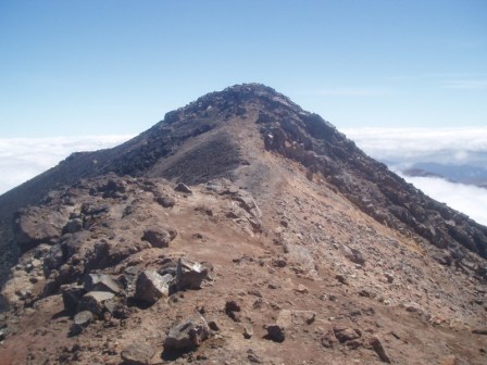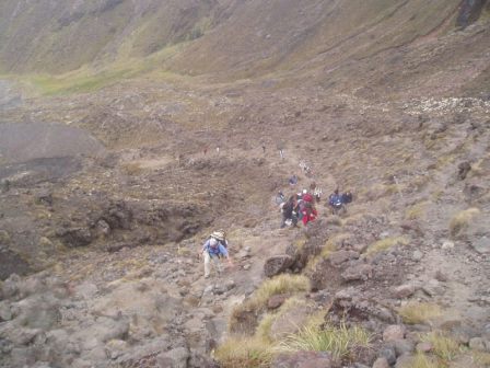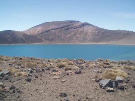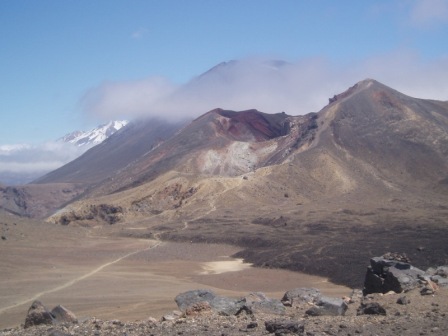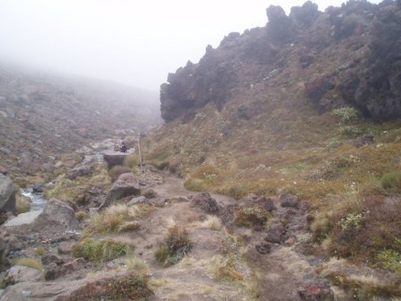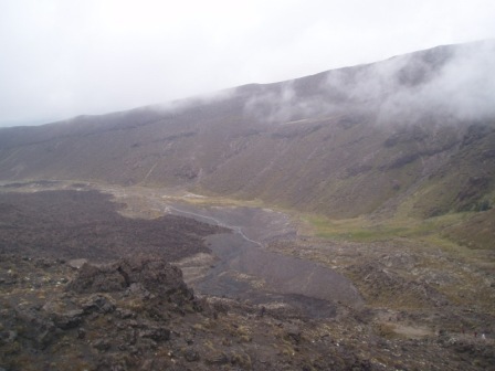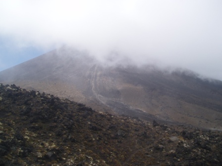 The only reason anyone ever goes to Turangi is to do the Tongariro Crossing, the undisputed best one-day hike in the country. When I arrived at 6PM, everyone was either sleeping (having hiked the trail that day) or carbo-loading for the early morning start. We took a bus to the trailhead at 8AM; visibility was nil, but they promised it would clear up. About 800 people do the crossing on any given day and most start at approximately the same time, so for the first hour I was tripping over all the intolerably slow children and elderly who had taken the challenge. There are two side trips on this route - one is to the top of Mt. Tongariro at 1967m and is relatively easy, the other is to the summit of Mt. Ngaurohoe, more popularly known as Mt. Doom - this is considered extremely strenuous and is frequently lethal. A hostel employee had told me repeatedly that the latter trip was utterly amazing, but he said just as many times that I shouldn't do it unless conditions were absolutely perfect and to definitely avoid it unless I came up with boots; based on this, I resolved to do the wussy Mt. Tongariro instead.