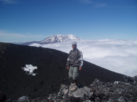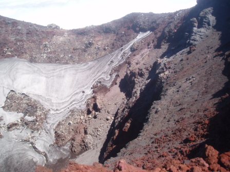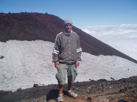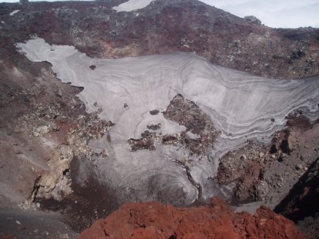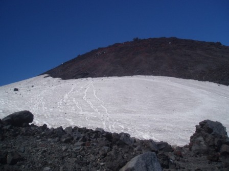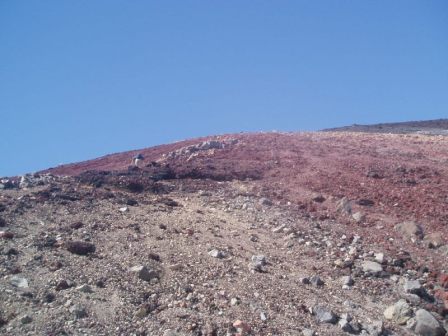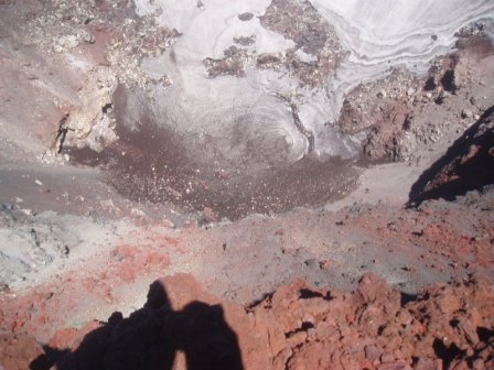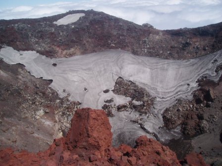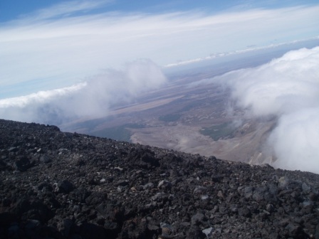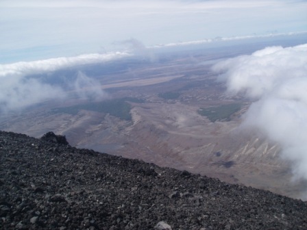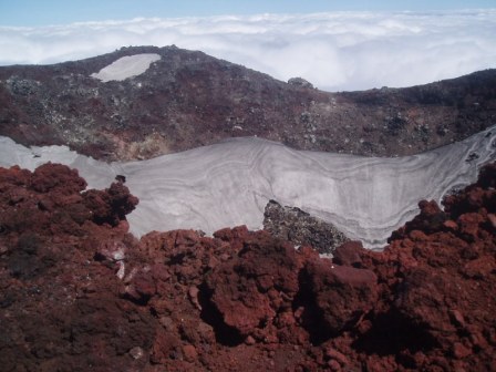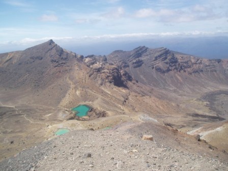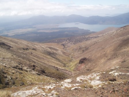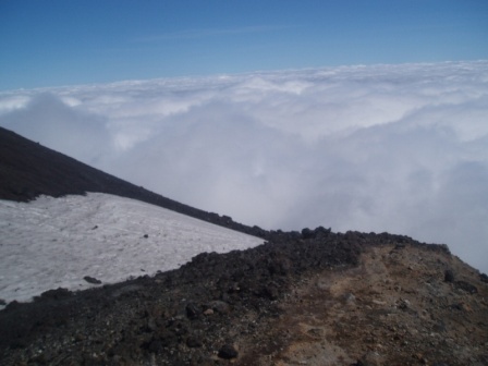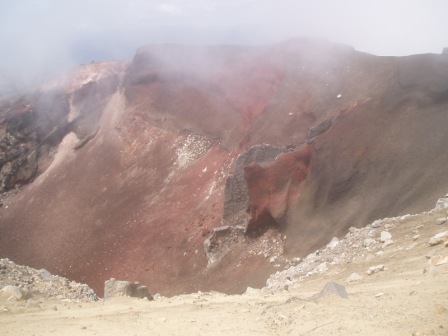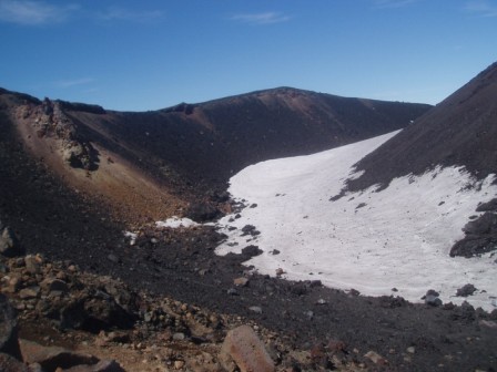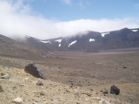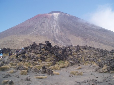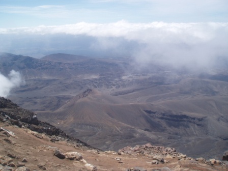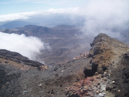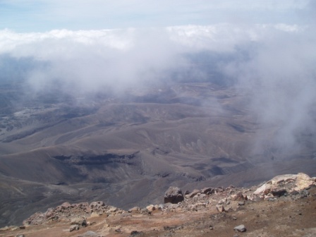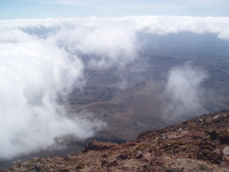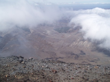 When I neared the turnoff for the mount, I spoke with a wizened old guy who told me that Mt. Tongariro wasn't worth the walk, and that Doom was incredible but I clearly wasn't equipped for it and my feet would be badly lacerated. I decided that, in the grand scheme of things, there were many things worse than lacerated feet (such as the hiker who had cracked his skull open the week before) and began the ascent up the steep volcanic cone (if Frodo could do it in his weakened state, I could surely do it with a good night's sleep, 2 liters of water and a bag of nuts and raisins). For a few hundred meters, I attempted to claw my way up the slipping rocks, but even the large, seemingly secure stones would just slip under my weight and slide down the mountain; at one point, a large boulder came barrelling down the mountain towards me, but at the last moment bounced off an overhead shelf and cleared my head by a meter. When a girl walked past me on her way down, I asked if there were an easier way, and she pointed through a break in the clouds to a long lava flow where everyone else was climbing up, aided by markers and plenty of good handholds. Moving over, I crawled up to the crater rim in about an hour and a half. I was up above a field of endless cloud and so could not see anything of the landscape surrounding the mount, but crossing a field of snow to get to the inner crater, I beheld a huge gaping hole from which past eruptions had occurred. I walked around the rim, witnessed unbelievable views of the surrounding countryside as the weather cleared up, and then began my rapid descent by sliding down the rocks, preceded by a minor avalanche as my feet stirred up thousands of stones on the way down.