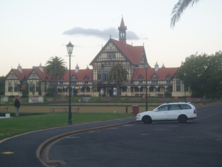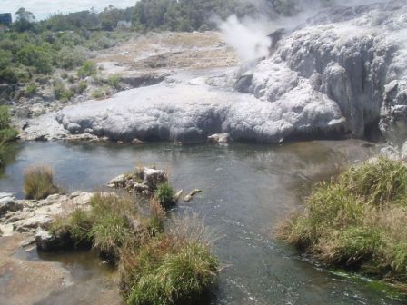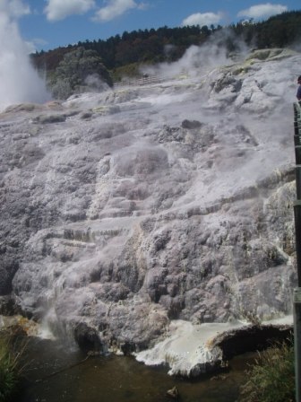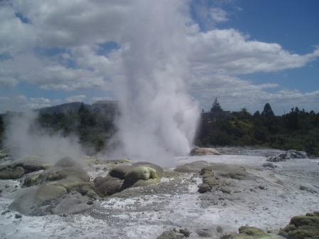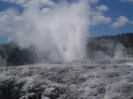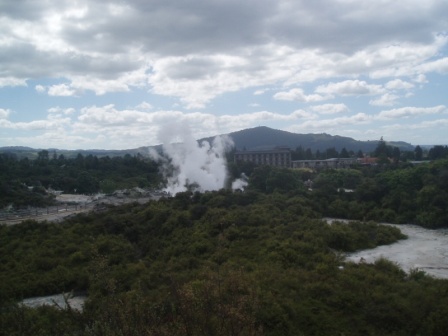 I went to the Redwoods forest where thousands of slightly confused Californian Redwoods grew to heights rivalling those in their native soil. From there, I raced to the Mauri Cultural Center to catch the midday concert which consisted of a bunch of scantily-clad people hitting the ground with sticks, flapping their tongues, and slapping their chests and butt-cheeks to catchy island tunes. In the same complex there was a "Kiwi Encounter" where a bird (not a fruit) supposedly lived; because of the animal's nocturnal nature, the room was completely dark and it was very difficult to say whether the furry outline moving about was really the rare, endangered bird, or just some imposturous beaver. Down the trail was a group of geysers; one was constantly erupting to a height of 3-7 meters, but the spotlight performance was one that erupted to 30 meters once or twice an hour; I never actually saw this or met anyone who had, and the staff seemed very reluctant to give any indication of the timeframe when it might next occur, so I suspect it was just a marketing gimmick. I ordered a hangi, which is a traditional dish put in a woven basked, wrapped in soil and buried in the earth with hot coals for 3-5 hours; somehow the microwaved version they served to me in a Styrofoam bowl after 5 minutes didn't really have the aura of authenticity I was looking for.
