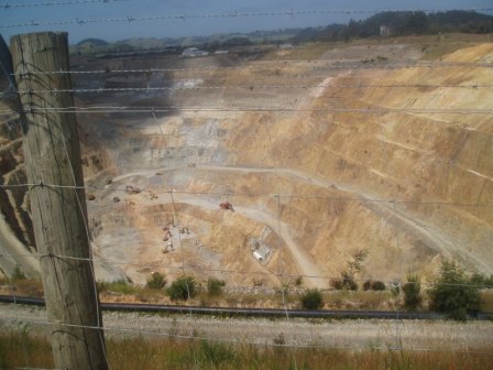The road through the gorge was akin to Cali's Big Sur - winding back and forth over countless hills with no shoulders to speak of. I took a break from the fearsome trail to walk through a mile-long railroad tunnel; this had no light besides a dim lamp ever few hundred meters, so I stumbled through the dark on uneven pavement pot marked with pools of water. At the end of the gorge was the town of Waihi to which tourists flocked from miles around to see the still operational gold mine, which, to be completely accurate, is really just a massive hole in the ground.