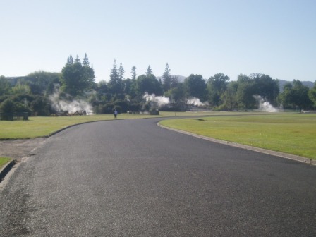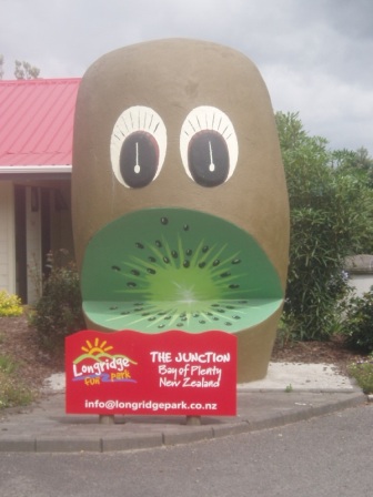 The next day I set out for Rotorua; stopping at the Te Puki tourist office, I was told that the road ahead was extremely hilly and terrible for cycling; this would have been a useful tidbit a few hundred kilometers ago. On the outskirts of Te Puke, I stopped at the kiwifruit factory which offered tours in a train made of kiwi-shaped cars and sold everything from special kiwi-eating spoons (that were both a spoon and a knife) to kiwi toothpaste.