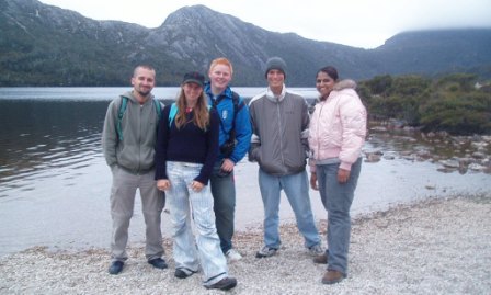 The road into the Cradle Mountain National Park was long and winding with only the occasional lookout to break up the drive; at one such stop, we encountered one Dutch and one American girl who we had seen on an earlier hike and who seemed to be following our exact path; they too had received a cookie from the lady in Triabunna, and they would have stayed at our Launceston hostel if only they hadn't run out of gas and car-camped in a random town in anticipation of the morning opening of the station there (gas is, for the most part, only available during daylight hours). We met up again at Cradle Valley (something similar to Yosemite Valley in terms of relative tourist draw, but unimpressive in its natural features) and all hiked around the periphery of the tranquil Dove Lake. My carload had taken a shuttle to the start of the track, but when we finished, the last shuttle had already left; so, warily eyeing the large dent in the back of their car, we got a ride with the girls; along the way, we flattened a wallaby that leaped into our path; the driver seemed to be on the edge of tears – the first kill is always the hardest.