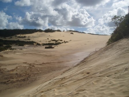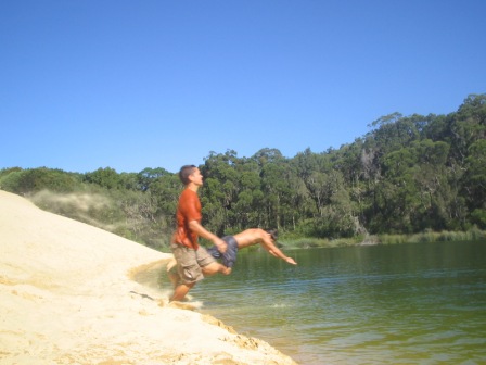 Two hotdogs and an apple later, we walked inland to Lake Wobby; here a high sand dune dropped slowly into a pristine green lake. We all raced down the dune by running, rolling and doing cartwheels. At one point it was decided that we would form a chain of ten by grabbing the ankles of the person before us and simultaneously rolling down; it eludes me how we escaped serious injury with that one.