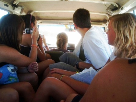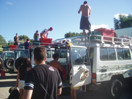 In the morning we grabbed a few more pancakes, assembled our gear, got our food ration, and packed everything on top of our 4WD. After an hour of preparation, we all piled into the truck and triumphantly turned the key; the ignition made just a clicking sound and so we watched forlornly as the five other groups drove off to the island without us. We waited another two hours while a mechanic threw in a new starter motor, then we were off (though the speedometer was broken and one of the doors didn't open). We had been given bad directions and got a bit lost on the way to the barge, but we put our heads together and managed to get to the launch 20 seconds before the last boat of the day departed.