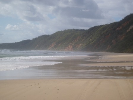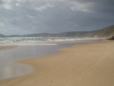 In the morning, I grabbed my free pancake feast and set out on what appeared to be a quick hike down the beach. I measured how long it took me to pass a certain feature on the map and then extrapolated to get an estimate of the full trip – I guessed it would take around 15 minutes. Two hours later, I began to suspect that my tourist map was not entirely to scale (perhaps I should have guessed this earlier from the fact that the cove's sea monster was depicted as being longer than the entire beach). The path was lined with high sand cliffs with an amazing array of colors. 4WDs frequently zipped by at 80 kph along the sand (in retrospect, this would've been a much better approach to the trip). After 11K, I went through a pass to the neighboring TeeWah beach; this lacked any scenery but was stained blue with the carcasses of thousands of man o' wars (these made cool popping sounds when you stepped on them – kind of like bubble wrap). There was an old wreck which didn't resemble much of anything; it was apparently full of asbestos so I had to resist the urge to play on the rusty pile of scrap. 7K on this stretch and the beach was replaced by a subtropical rainforest. Here it would rain just long enough for me to pull out my poncho and stop for just the right interval for me to get hot and pack it away. On this trail I would come across my very first leeches – these nasty little critters crawl inside your socks and suck your feet dry – this really wasn't conducive to walking the remaining 15K.