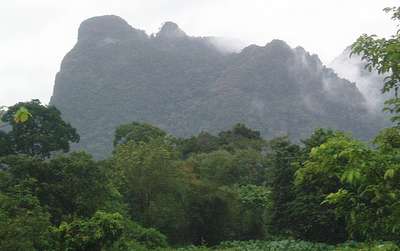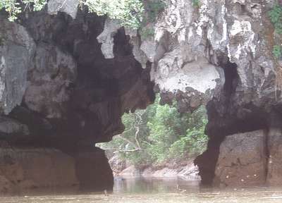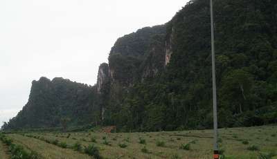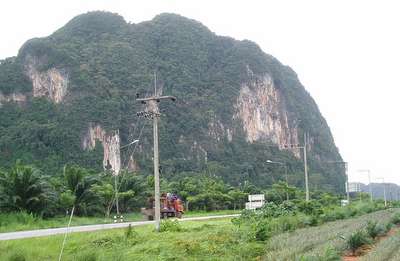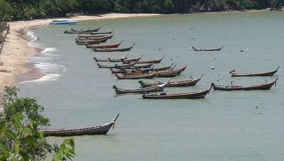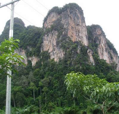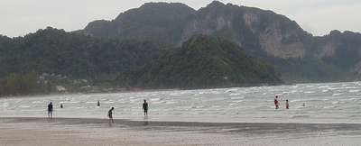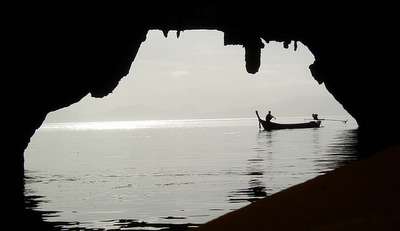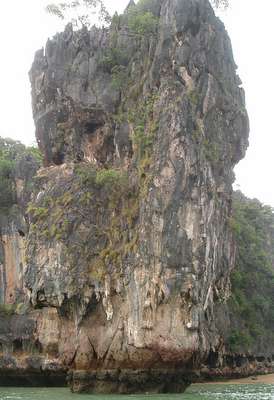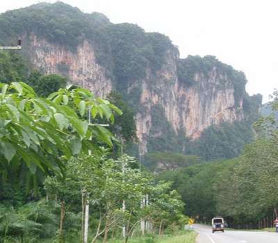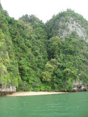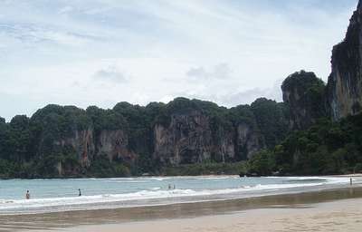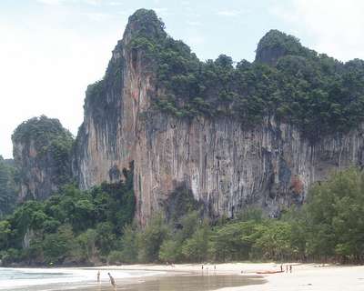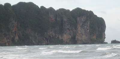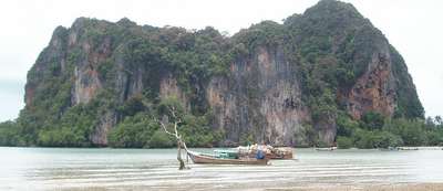 Returning to town I took a boat from Ao Nang Beach out to a group of beaches that were world-famous for their rock climbing. The boat went straight out through the 2-m surf and was adeptly steered over each peak; though as one particularly huge wave crested right before our bow, our fate became clear and all my possessions were instantly soaking wet. We surfed into shore and just barely made it without tipping. There were a number of shops offering half-day rock-climbing trips but slogans such as “all instruction provided" and “fun for all ages from 5-105" deterred me, and I was content to just march through the formations of Diamond Cave and hike through the construction zones of the surrounding beaches. I returned via the “all-weather route" to the other side of the peninsula and grabbed a songtaew back to my bike.
