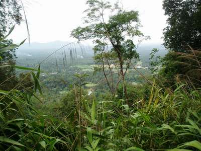 Another country road took me north to Khao Kitchakut National Park and the impressive 13-tier Krathing waterfall; as usual, a treacherous trail rose gradually up the slippery slope with viewpoints at every tier to the 9th. From there, the path turned into a scramble up a sheer rock wall with only tiny foot and handholds in algae-covered cracks; I passed a sign written only in Thai script that I later gathered must have said “Turn back now if you want to live". At this point I wasn't anywhere near the falls and never saw the 10th or 11th tiers, but I did get a great view of the surrounding countryside. When I'd reached a patch of level ground, I called the visitors center to ask if there was actually a path beyond the 9th tier and, if so, whether there was another path down; after describing my situation in what I perceived to be perfect Thai, the voice on the line only said “Ummm… can I help you?" – trying again in English, the lady gathered that I was in Chanthaburi and needed driving directions to the falls – it sure is a good thing I bring a phone along for emergencies.