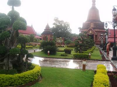 We rocketed down the superhighway (sometimes reaching speeds in excess of 100kph) to the town of Lampang. This is the only place in Thailand where horse-drawn carriages are still used for public transport. Following a few hours of Ben Hurr style races down the city's thoroughfares, we made our to the "most beautiful wat in northern Thailand." We killed 10 minutes or so so there before continuing on to Phrae (did you just think "Fray"? Better go back and look at my speaking guide!) where we found several other old wats, a teak mansion, and various other mildly interesting edifices. Before arriving in the town we happened upon a rock garden which featured giant stones which, given sufficient hallucinagens, resembled elephants, camels and stegasaurii.