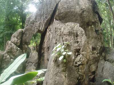 In the morning we followed a cave sign and a few sets of directions to an operational quarry. There were no further signs, but we did find a chunk of rock that looked as if it might have caves. The area was heavily overgrown and we had nearly given up when we sighted a Buddha statue through the trees. Armed with headlamps we crawled back through Amarin Cave where we were nearly lost in a labyrinth of tunnels, dashed upon sharp rocks, and eaten by bats, but in an hour's time, we managed to escape unscathed into the sunlight.