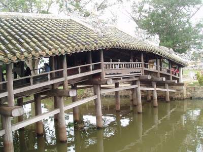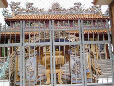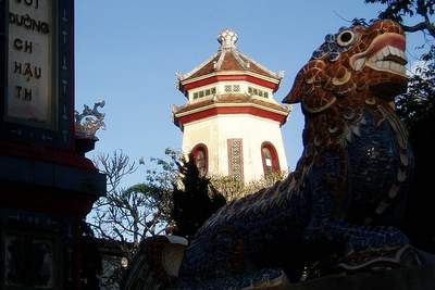 Hue (pronounced 'Hwey') is a pleasant river town full of history, tourists, and motorbike/cyclo taxis. It's also a dieter's hell, as some years back it was home to a guy who demanded every night that 50 dishes be prepared by 50 cooks, and as a result, the streets are teeming with tasty snacks that cost around a nickel a piece. On my first day there, I wandered around a dozen different pagodas, went to the war museum (which was ever-so-slightly biased against us), and went to the imperial palace, which may have merited its 55,000 dong admission price at one time in its history, but (thanks to those pesky Americans) was now mostly just one big pile of rubble. For dinner I went to a restaurant run by a deaf guy, which was flanked by two other restaurants run by deaf guys (it leads you to wonder just how many deaf restauranteers one neighborhood can have); using only sign language (actually, nothing's really new there) I ordered "roll-your-own" spring rolls which were essentially the oriental equivalent of fajitas; my spring rolls never looked even remotely like what you'd order at a restaurant and usually had to be eaten with a spoon, but they were tasty nonetheless.
