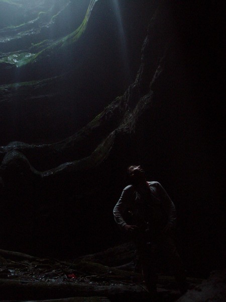 Piet rappelling down into pit