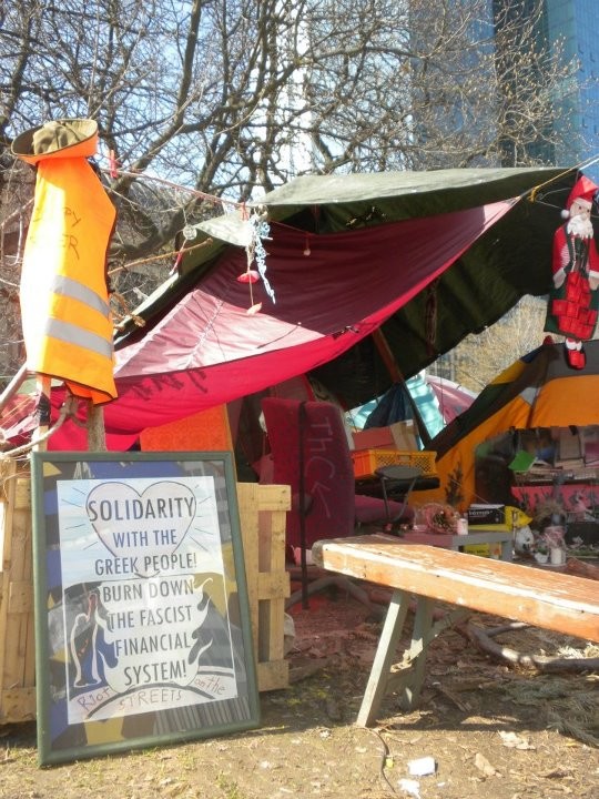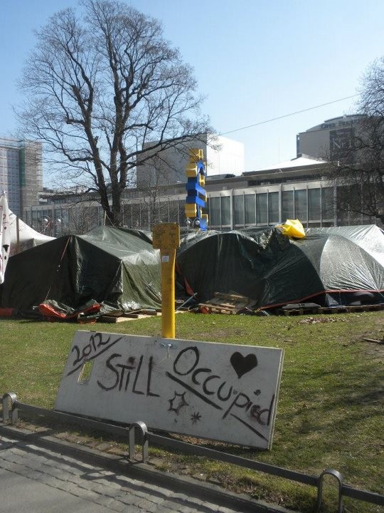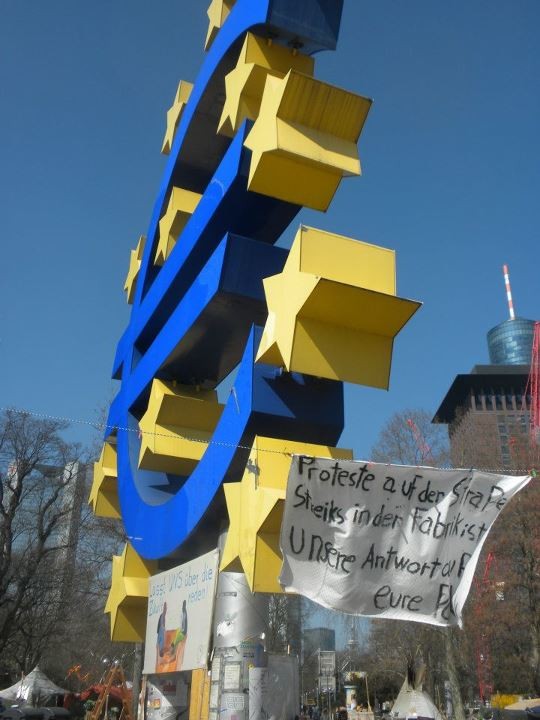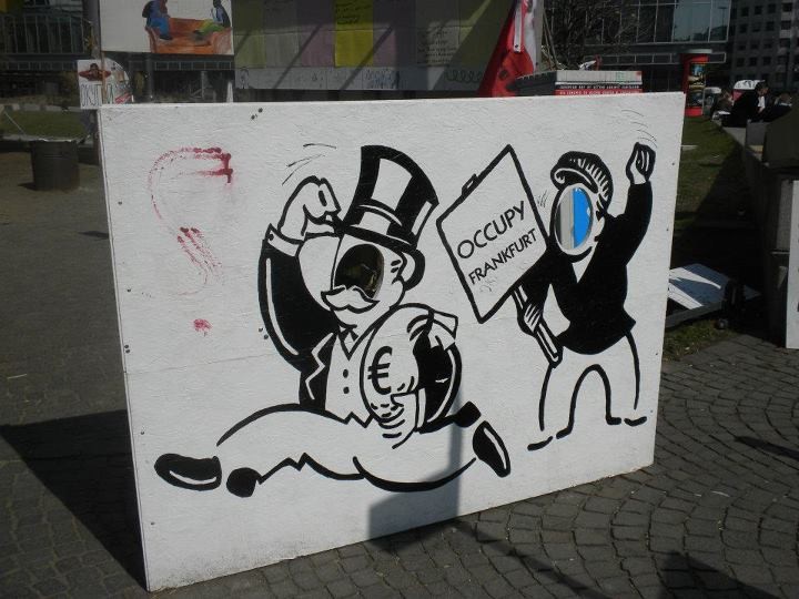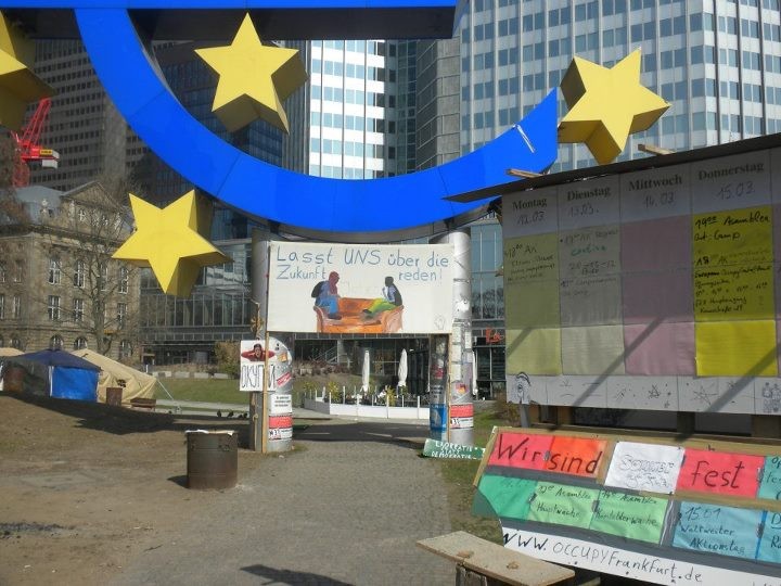 The best deal on transport was a "collective" all-day train ticket which was good for up to 5 people and cost 15 euros; we considered recruiting three others to split the cost and spend the day with us, but sleep deprivation had left us inadequately outgoing. A few hundred meters out from the central station was the thriving Occupy Frankfurt movement. A tent city with over a hundred residents had filled one of the parks and was equipped with running water, electricity, internet, and a tourist information booth. Matt wanted to join one of the ongoing meetings and help to plot the overthrow of the pervading financial system, but his German was sadly lacking.