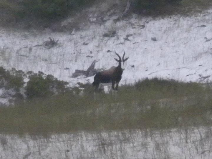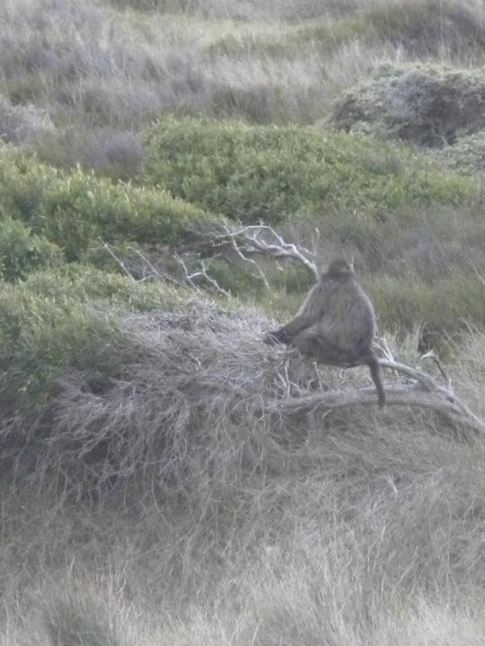 As we explored many of the other roads in the park, we spotted a number of ostriches and several of a certain species of antelope. Despite the myriad signs, we had yet to see a single baboon, but since the park would be closing soon, and there was a 500R fine for anyone caught staying after 6:47PM, we prepared to leave without. We stopped on the side of the road to pee in some bushes, when, with a standard pensive mid-pee gaze, off in the distance I spied a lone baboon. We clambered over a couple dunes and soon found there to be a whole troupe of the creatures, complete with a handful of playful babies. We wanted very much to approach them, but the six-thousand and seventy-three signs we had seen up until that point regarding the danger presented by baboons had managed to instill in us the slightest flicker of hesitation, and we returned to the bikes without any further provocation. As we readied our gear, a young baboon swaggered past about half a meter from Matt, while he remained blissfully unaware that he was almost certainly about to have his face ripped off.