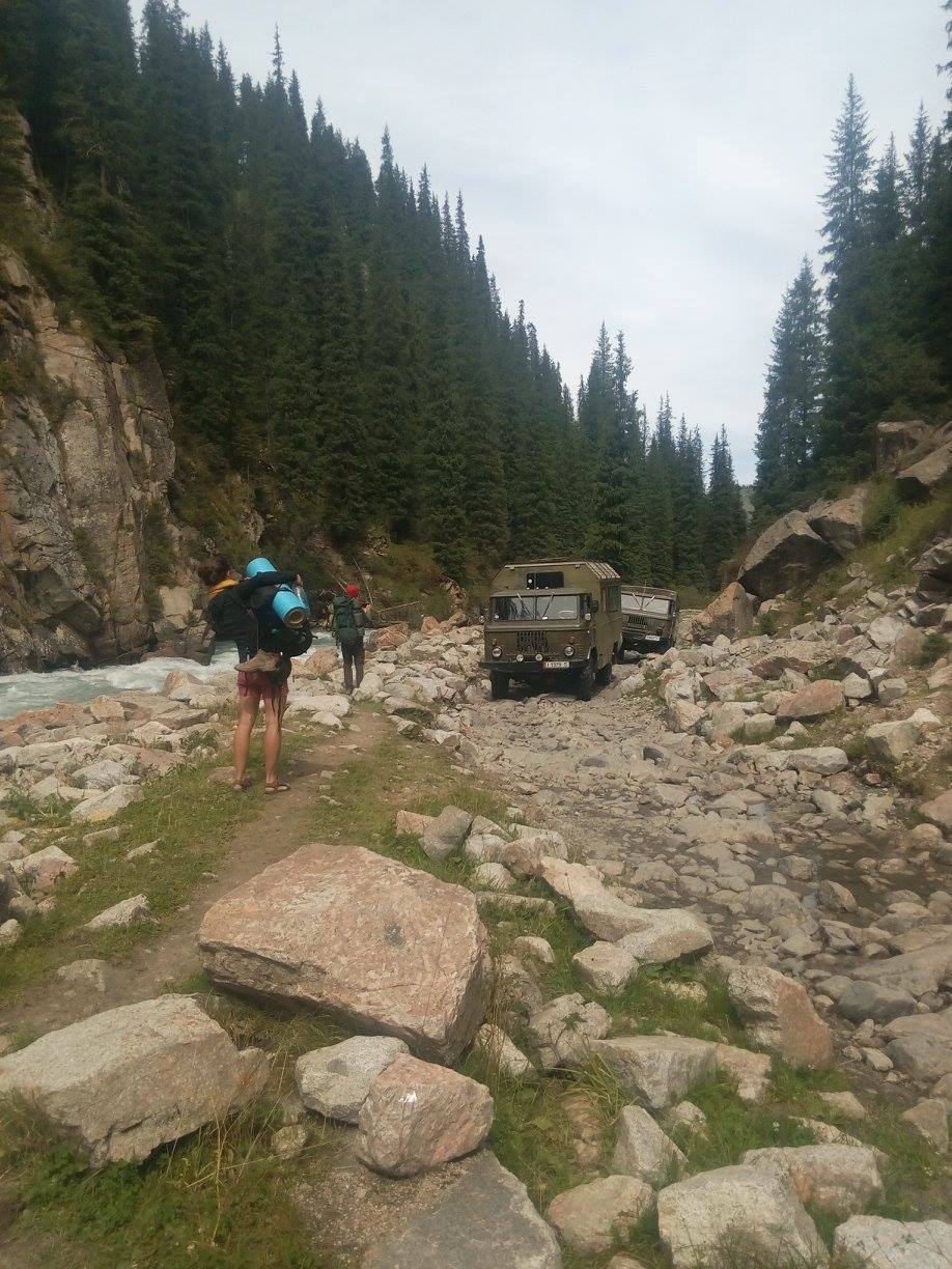 With similar ease, we escaped from the canyon and made our way to the town of Sati. Peter and Maria, though staying in a tent in an open pasture, managed to power through five hours of morning sun and sleep till 11, unconcerned that we might miss the Saturday morning tourist rush to our next destination, the Kolsai Lakes. When we finally swaggered out to the road, an ancient Russian hatchback immediately rattled up to us and the driver claimed he was on his way to the lakes. He smelled as if he was about a bottle of vodka shy of sober and it was fairly apparent that he had pulled out of his driveway when he saw us coming, but he was offering a free ride and we didn't see any better options forthcoming. We awkwardly piled in amidst piles of junk; the sharpened edge of an axe rested against my exposed left ankle.