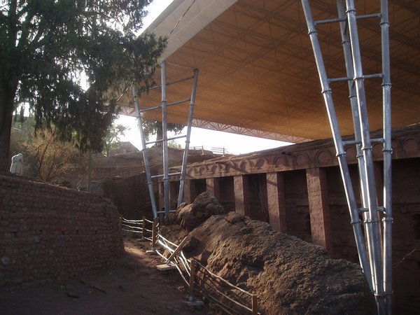 We were accustomed to getting up at 4 and were therefore quite ready to explore the famed rock churches at the crack of dawn. There were no tourists about at this time, only active services, locked doors, and an utter lack of explanatory signs. We soon found that it was quite difficult to see any of the attractions appropriately, despite having parted with a $20 admission fee. We would try to enter a structure or cross a bridge spanning a 20m-deep chasm and someone would yell at us in Amharic and make incomprehensible hand gestures; we eventually gave up on the first group and headed for the most famous of the town's churches, the cross-shaped Bet Giorgis.