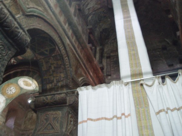 It was no little effort to track down the priest in charge of the place, but we eventually got him to let us in and show us the tapestries. Surrounding the monolithic rock-hewn church, there were a number of small cave dwellings, along with open graves that held some well-preserved mummies.