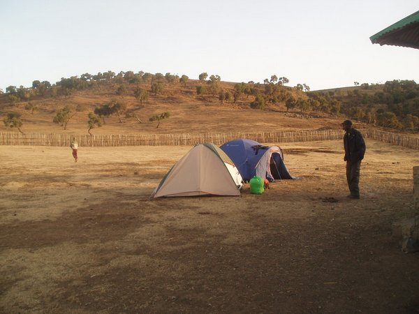 There wasn't a whole lot to do around camp. One of the guys committed the sacrilege of using the camp's cold shower to wash off some of his accumulated grime. We again gathered around the IPod speakers for "This American Life" and awaited the completion of the painfully slow cooking process. Around 5PM, two buses stacked high with mattresses pulled up to the camp and unloaded around 60 college students. Within minutes, a massive tent city was built; two sheep and a goat were brought in for the slaughter, and a massive bonfire was prepared. This was a group of tourism students from Gonder University; one of them wore a Gators sweatshirt, and I let out a rousing "Go Gators" in his direction, but I received no response, and no further attempts were made at communication between the two groups. Luckily they made less noise then we'd expected and the tranquility of the spot was only partially spoiled.