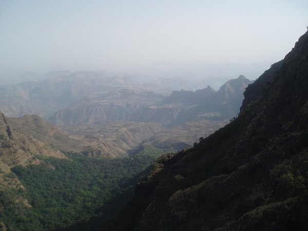We were up at 6:30, ready to eat the breakfast that was to be prepared for us by that time; unfortunately, the cook had been waiting on us to ask us where to find our oatmeal, and he took another hour to prepare a pot of watery porridge (even though it was the instant variety). After our tea and nourishing gruel, we broke camp (where 'we' mostly implies our hired team) and we started hiking along an incredibly scenic escarpment where cliffs dropped over a kilometer to the lush valley below. Troops of Gelada baboons scurried along the cliff edge, alternatively fighting and grooming each other. It was about a 4-hour hike to the Sankabar Camp where we ate our prepared lunch of cabbage, potato, and carrot sandwiches.