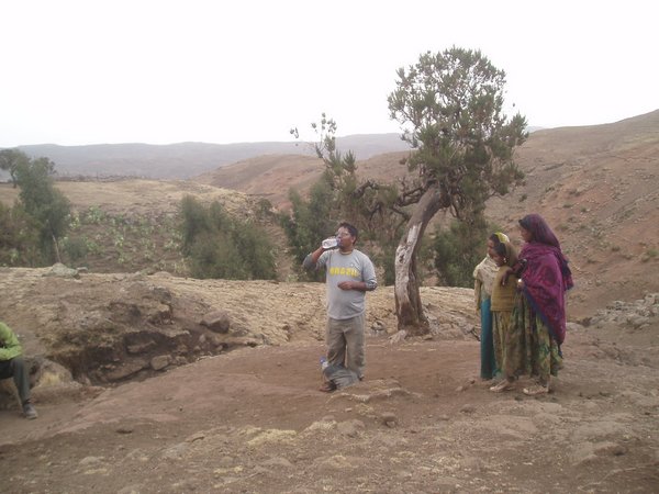 We passed along a winding road which followed lush mountainsides and looked down on valleys that were amazingly verdant considering that every single riverbed was bone dry. Villagers hiked towards town with bundles of chat (a mild stimulant which is Ethiopia's second largest export after coffee) and other produce. We arrived in Woldia sooner than expected and stopped for breakfast; I shared a pile of meat and tea with a local teacher and tourist guide.