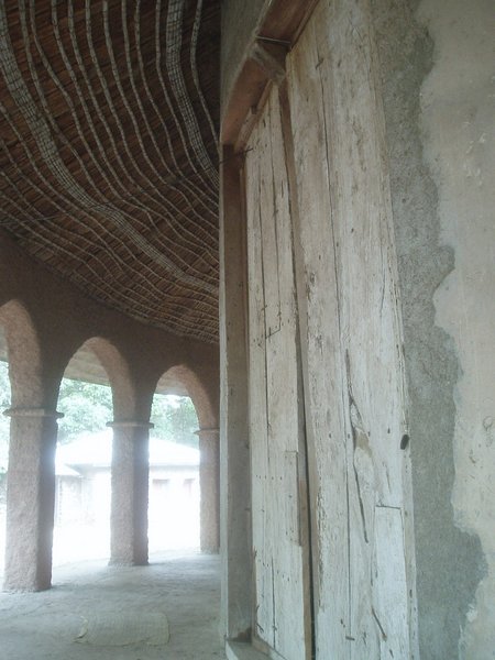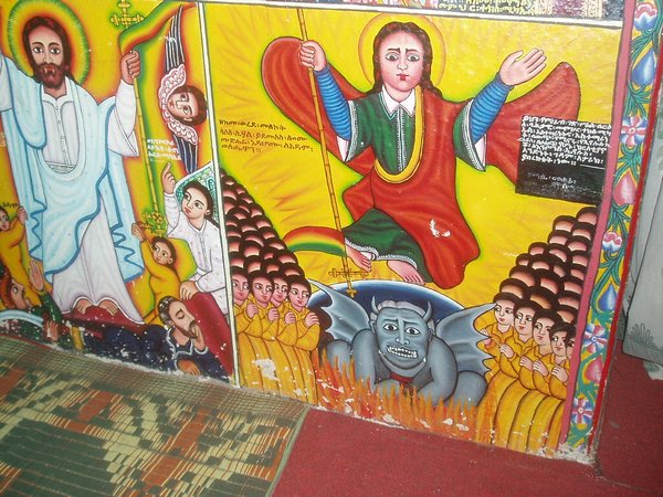 Fasiladas Bath was a bit harder to find; this was one of those instances where the guidebook simply shows an arrow pointing off the map with an estimated distance; presumably it is on you to ask directions and figure out the rest of the route; in this case, a long sequence of such directions led me in a complete loop around the place. The guidebook likened it to Angkor Thom for the trees that grew out of the ancient walls, but besides that aspect, it wasn't overly exciting. Nearby, at the top of a steep mountain, was another castle complex called Kuskuam; even though I showed up smack in the middle of the afternoon opening hours, no one with keys to the place could be found. Clear on the other side of town, Debre Berhan Selassie Church displayed a cool outer façade, as well as an impressive collection of biblical murals inside; I ran into a pair of Englishmen here who had just spent a month traveling around Sudan - they were a rather stoic group, and would only say that "it was different."