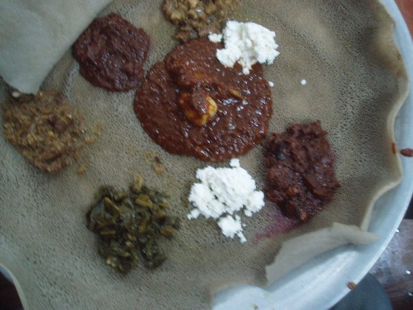 It will probably surprise just about all of you to learn that Ethiopia has some of the largest portions in the world. In every country that I'd traveled in up til now, I'd always been able to clean my plate, but here it was consistently impossible for me to finish whatever I ordered. This was ok, because people here believe it is bad luck to finish everything served to you, and so you needn't worry about someone dropping by to chastise you, saying that there are starving children in America you should be thinking about.