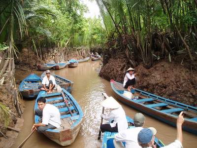 After our two-hour "scenic drive" down the mostly featureless highway, we arrived in the town of Mytho. We took a motor boat on a trip through the palm forests to see a number of villages that had been engineered by the tour companies to each sell us a different specialty (allegedly, a family tradition for a hundred years); the first was mass-produced coconut candy and rice wine followed that and then the ever-popular coconut bobble-heads. The prices were always hyper-inflated and we were always left on the island for ong enough that we became sufficiently hungry or bored to buy something. At least one of the brochures had mentioned "a chance to bike-ride around each of the islands;" as it turned out, however, this "chance" was significantly diminished if you were unwilling to rip-off the locals' bikes.