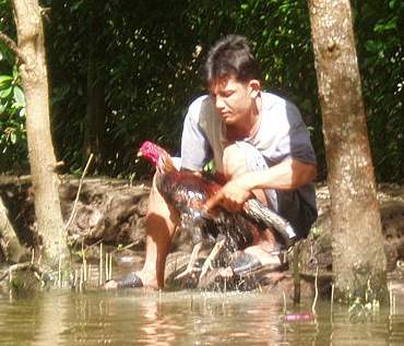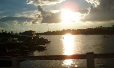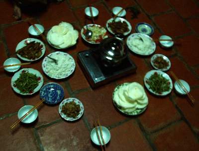 One brochure had claimed that we would sail into sunset towards Cantho; it's debatable whether there was actually a navagable passage between the two cities, but at any rate, we ended up spending a few more hours in the bus. At Cantho, the two Montana girls and I were loaded on to a cyclo (motorcycle with tiny cart attached) and carried to the edge of town; here, three motorcycles took us out to the country to our homestay. Two German guys had arrived before us; they were both deaf, but were experts at reading and writing English, and were far more adept at communicating with the Vietnamese through signs and pictures than we could ever hope to be. The family prepared us a feast and tried their best to show us how to correctly eat it as we all sat in a circle on the empty wooden floor of the living room. The meal was accompanied by a 2-liter bottle of rice schnapps (100 proof), and someone among the family would spontaneously decide that we should all take shots about once every 5 minutes.