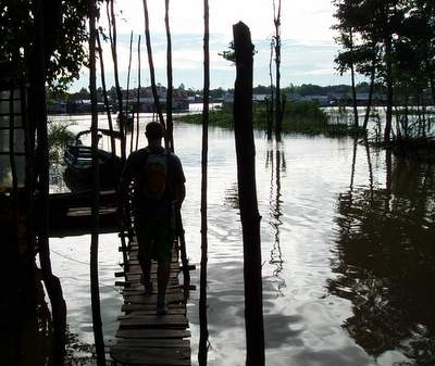 The family set up paper-thin mats on the same floor where we had eaten hours earlier, and draped big mosquito nets over each; there seemed to be about 7 people in this family who were scattered in various nooks and crannies around the property; two were sleeping in hammocks suspended from the porch by American parachute straps.
