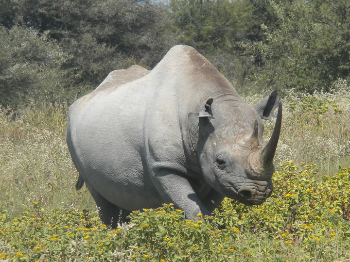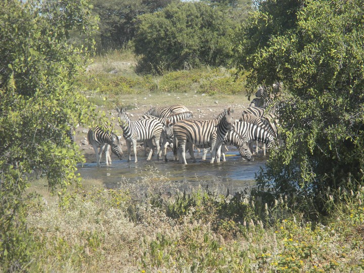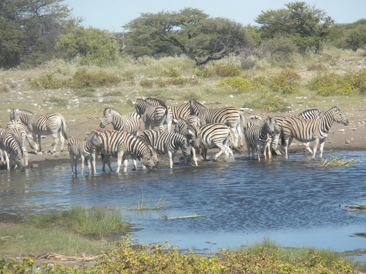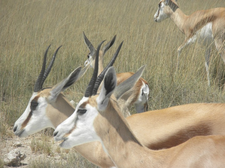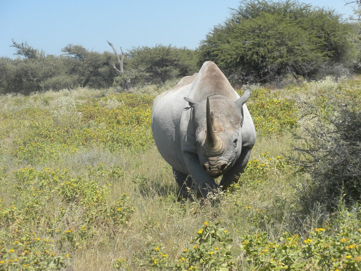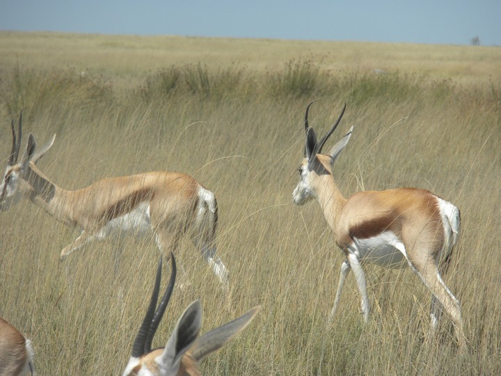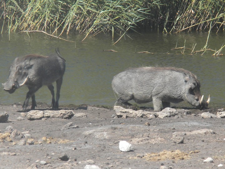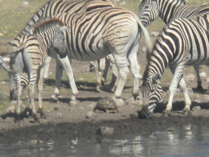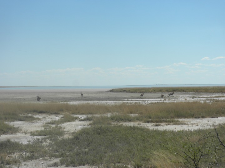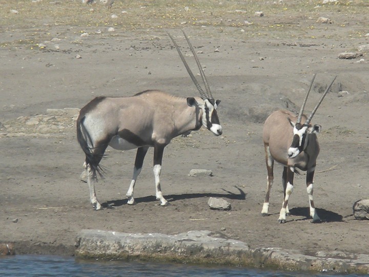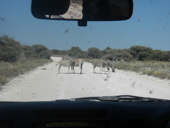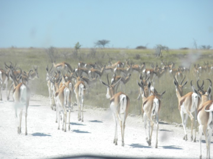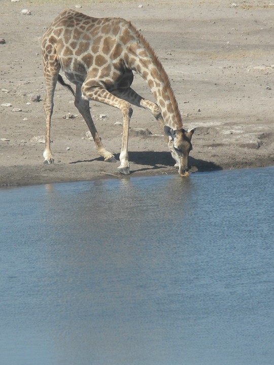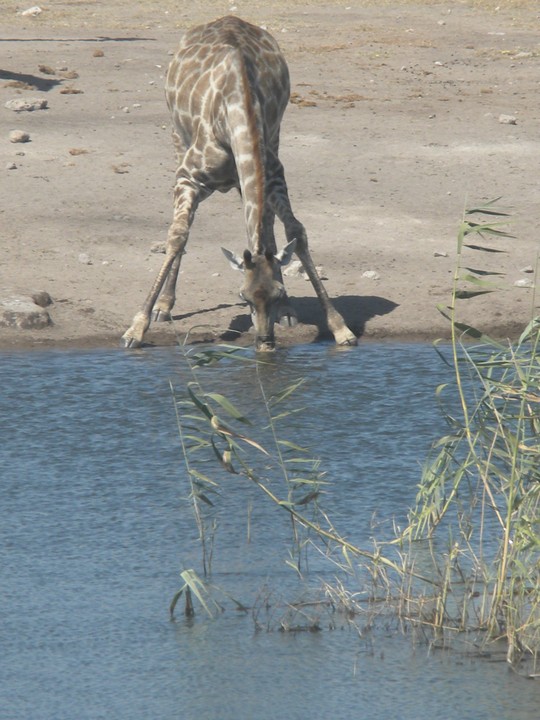 We were packed and ready when the park opened at 6am, but that was still not early enough to catch the two cars that whizzed through just before we got to our post. We waited for two hours, as the ranger helped us catch and beg each in the small trickle of tourists who entered the park. Every car was either full, unwilling to take us (admittedly, we probably smelled pretty rank by then), or wasn't doing a day trip. Finally, around 8:30am, a Namibian/German woman and her young daughter volunteered to take us. The mother had been there around fifty times and was an expert on the park. Our first foray to the eastern section of the park yielded nothing, but as we headed west, we soon came to a watering hole where we were able to watch as a number of giraffe came up, scared away the other animals, and very cautiously knelt down to drink. On our way back to the main road, the daughter noticed a shape off in the distance and excitedly cried out "rhino!". Sure enough, a black rhino bumbled right up to our car, too blind to even notice we were there; our host scooted us out of the way just in time to avoid an accidental impact.