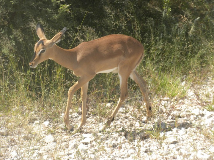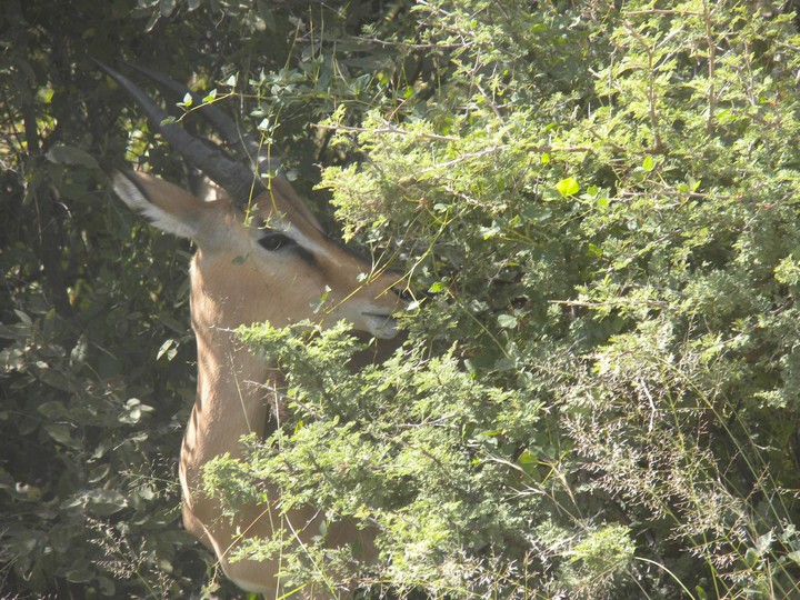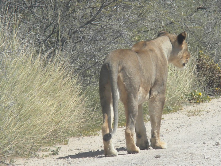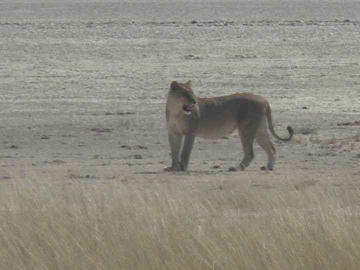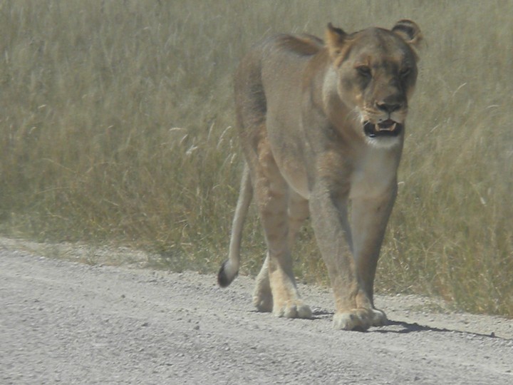 On the way out of the park, we stopped next to another car that had parked in the middle of the road; they had somehow managed to spot the butts of two sleeping lions in the trees. This was pretty exciting as we imagined we had zero chance of seeing a lion in the daytime. We tried our best to get a clear picture of the butts, but soon gave up and continued toward the gate. But then, coming down the side of the main route, was none other than a lioness. Our driver made us roll up the windows as the lion stalked casually past and slunk into the weeds on the side of the road. We spent the next 45 minutes catching glimpses (or supposing we caught glimpses) of rustling grass that tipped us off to the location of the hunter. Then, as our patience neared its breaking point, the lion exploded out onto the open plain and into the middle of a group of oryx. They easily evaded her and, ashamed, she slunk silently away.