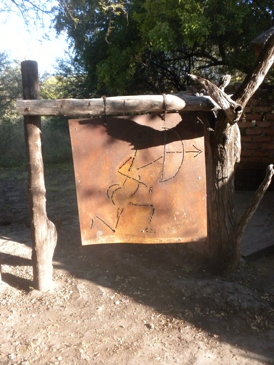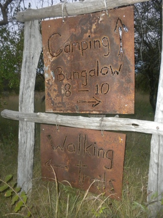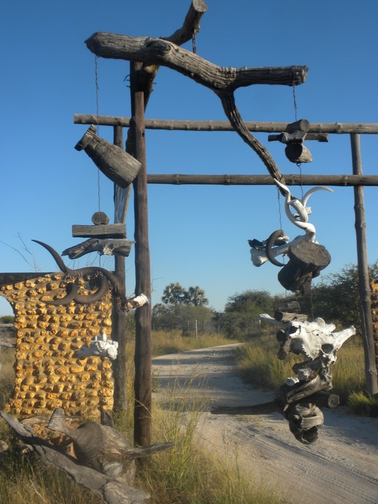 We drove into the night where I shortly found that, given that my headlight pointed up into the trees, it was not altogether useful for seeing what was in front of me. Every car that approached chose to keep its brights on, eliminating any hint of orientation left to me. For the last 50km, I had only the Force to guide me. Luckily, this, the mystical energy connecting all living things, did not let me down, and we reached Roy's Rest Camp (13km further than suggested by the book) without hitting any killer potholes or wandering antelope. The entrance to the camp was creatively adorned with a giant windchime made of cow skulls, and was the perfect welcome given the hour.