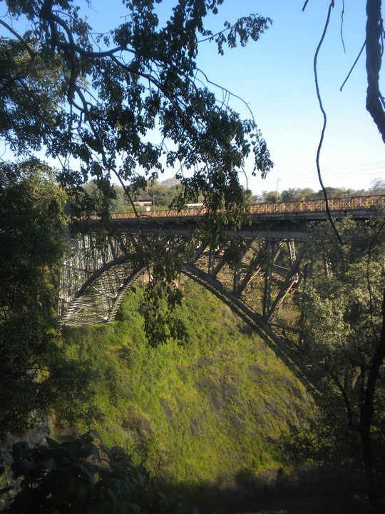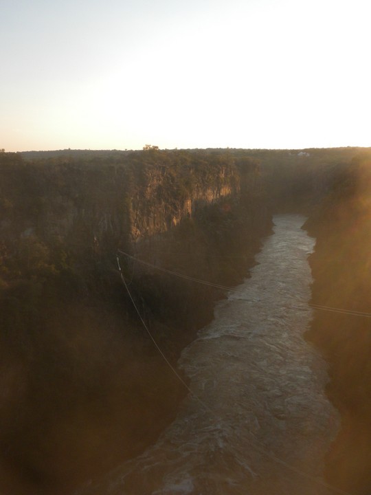 The park rangers advised us to steer clear of the trails through the town's jungles, since at that time of day we would likely be trampled by elephants or devoured by lions, and recommended that we instead walk down to the bridge for another viewpoint of the falls. We stopped by the Immigration office and got a gate pass rather effortlessly, walked through the troupe of monkeys and handful of warthogs that hung out at the border fence, and proceeded onto the bridge. No one was manning the bungee jump or gorge swing, so we hopped across the line into Zambia and subsequently raced back to the falls parking lot to collect our bikes before closing time.