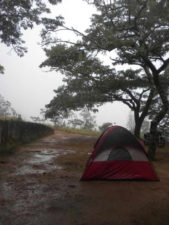 We awoke to find ourselves lying in puddles and all of our gear similarly soaked. The rain continued, so we made porridge and tea in our neighbor's deluxe tented kitchen. We realized it would be suicide to ride any further, given the slick rocks and mud on the way out - not to mention the threat of getting soaked through by the constant, cold mist. We had no choice but to wait for the departure of the cloud that sat atop our camp and for the sun to bake the sodden road for an hour or two.
