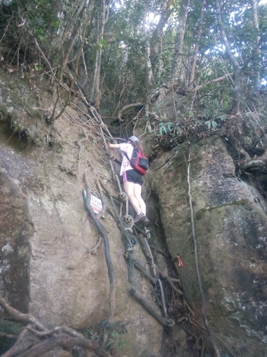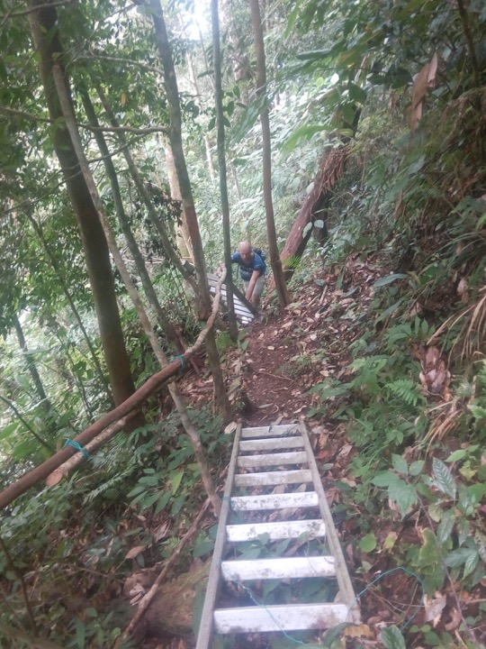 The terrain was immediately difficult and we grappled up steep muddy slopes using thick vines and root systems. Exposed metal ladders, 20 meters in length, ran up the cliffs, but the rungs were extremely slippery and only the junctions with the rails were of any real use. And then there were the leeches. They were silent and fast and invincible. They would grab onto the sole of your shoe and be crushed against rocks a hundred times before slowly moving up and finding a patch of skin. They would crawl deep into your sock or far up your pant leg. Many would make the long journey from ground to groin. Others would drop from the trees and find purchase on our scalps and necks and faces. We never wanted to stop to pull them off because we knew that doing so would only allow more to catch us. We felt our life slowly draining away, into the bulbous black bellies of a hundred tiny assailants.