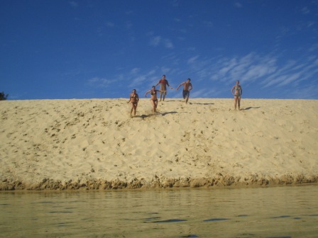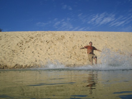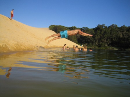 Two hotdogs and an apple later, we walked inland to Lake Wobby; here a high sand dune dropped slowly into a pristine green lake. We all raced down the dune by running, rolling and doing cartwheels. At one point it was decided that we would form a chain of ten by grabbing the ankles of the person before us and simultaneously rolling down; it eludes me how we escaped serious injury with that one.
