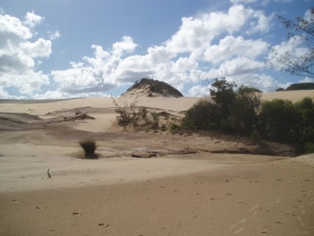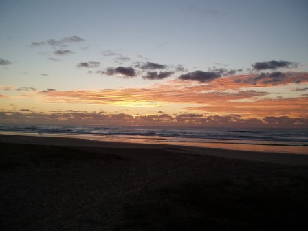 I returned to the hostel just in time for the mandatory pre-trip briefing; here they showed us safety tapes that warned not to feed babies to dingoes or sleep in the middle of the beach/highway. We got to sign a series of forms explaining that despite the $550 we had collectively put into a deductible-reducer, nothing was actually covered, and if any one of the group's 11 members so much as nicked the paint, we'd all be losing our shirts. At the same time, my group filled out an order to the bottle shop for six cases of beer and several boxes of wine – the chances of getting that $200 deposit back weren't looking too great. After the meeting, a hostel worker drove us to the town's giant sand drift and abandoned us there; the promised sunset was behind a cloud, so we snapped a few photos of the sand (can never get enough sand photos!) and hitchhiked home. Strangely, the best deal on food was from our hostel - $4 for all-you-can-eat burritos – in no way did these resemble burritos but after no food for 12 hours and a 35km walk, dogfood would've been a thrill.