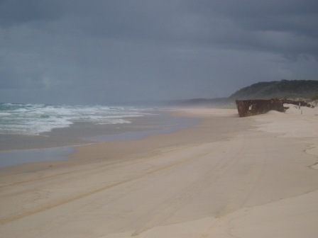 In the morning, I grabbed my free pancake feast and set out on what appeared to be a quick hike down the beach. I measured how long it took me to pass a certain feature on the map and then extrapolated to get an estimate of the full trip – I guessed it would take around 15 minutes. Two hours later, I began to suspect that my tourist map was not entirely to scale (perhaps I should have guessed this earlier from the fact that the cove's sea monster was depicted as being longer than the entire beach). The path was lined with high sand cliffs with an amazing array of colors. 4WDs frequently zipped by at 80 kph along the sand (in retrospect, this would've been a much better approach to the trip). After 11K, I went through a pass to the neighboring TeeWah beach; this lacked any scenery but was stained blue with the carcasses of thousands of man o' wars (these made cool popping sounds when you stepped on them – kind of like bubble wrap). There was an old wreck which didn't resemble much of anything; it was apparently full of asbestos so I had to resist the urge to play on the rusty pile of scrap. 7K on this stretch and the beach was replaced by a subtropical rainforest. Here it would rain just long enough for me to pull out my poncho and stop for just the right interval for me to get hot and pack it away. On this trail I would come across my very first leeches – these nasty little critters crawl inside your socks and suck your feet dry – this really wasn't conducive to walking the remaining 15K.