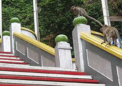 I took a bus out of town to the Batu Caves; these were a series of impressive hollows in a giant mound of rock that jutted out of the flatlands. The first cave was filled with amazingly colorful Hindu artwork and the second had scriptures from the Bhagavad Vita which would have been much more insightful had I been able to read sanscript. The largest cave began with a 270-step staircase. Signs everywhere said "Beware Monkeys," but I didn't take this seriously until I noticed that there in fact several dozen monkeys running down the banisters and the surrounding rock. I wasn't clear on what I needed to be wary of until one of the monkeys leaped onto a man's chest, screeched in his face, and stole the bag of food he was munching from - he gave up far too easily and didn't give me time for my camera to boot up.