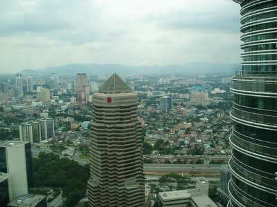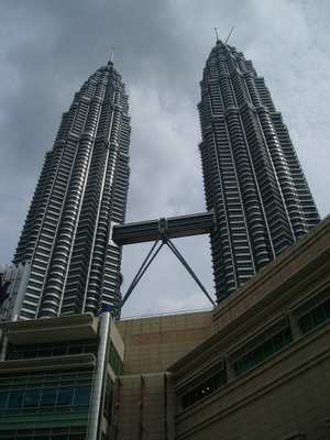 I arrived in KL at 9:20, and having lost so much time, I immediately set about getting hopelessly lost. I did manage to find a South Indian restaurant where I got pancakes and dahl on a banana leaf for a quarter. Next I took the city's monorail up to the famous Petronas towers (higher than the Sears Tower by 10 meters) and got a ticket to go to the bridge look-out 3 hours later (they only release 1500 tickets a day).