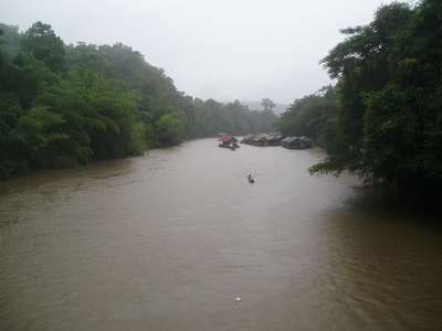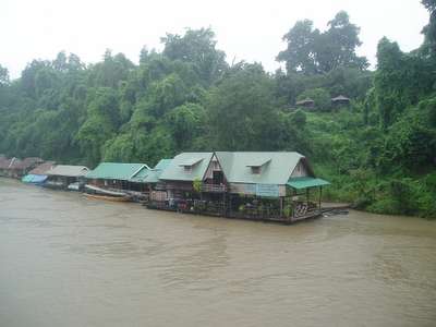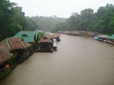 There wasn't much in the way of affordable accommodation in the area; the cheapest available was a 1200 baht houseboat. Apparently the next budget option was 100km down the road in Kanchanaburi. So I sped back through the dark and rain for the next two hours, coming oddly close to freezing to death a thousand kilometers from the equator. Arriving around 11, I got a room with no bath in the ever-popular Jolly Frog Backpackers for $1.75.