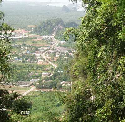 In the morning, I took a nearly empty, constantly twisting road through the mountains back in the direction of Krabi. On the way into town I visited the Tiger Cave Temple that sat several thousand feet above the surrounding landscape on an abrupt chunk of rock. Unlike in Kanchanaburi, they didn't have live tigers for guests to play with (it would've probably been quite a trick to get them up the 900-step staircase), but there were plenty of belligerent monkeys that would sit in the dead center of a step and force me to swing up the banisters to the upper levels. As could be expected, the views from the top were pretty incredible, and after I had regained consciousness following the ascent, I was inclined to stare out over the surrounding landscape and hold off on the return trip as long as possible.