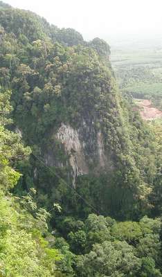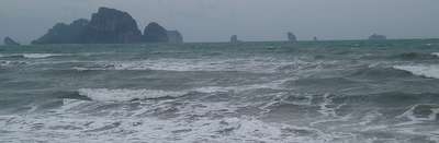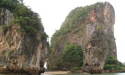 Returning to town I took a boat from Ao Nang Beach out to a group of beaches that were world-famous for their rock climbing. The boat went straight out through the 2-m surf and was adeptly steered over each peak; though as one particularly huge wave crested right before our bow, our fate became clear and all my possessions were instantly soaking wet. We surfed into shore and just barely made it without tipping. There were a number of shops offering half-day rock-climbing trips but slogans such as “all instruction provided" and “fun for all ages from 5-105" deterred me, and I was content to just march through the formations of Diamond Cave and hike through the construction zones of the surrounding beaches. I returned via the “all-weather route" to the other side of the peninsula and grabbed a songtaew back to my bike.