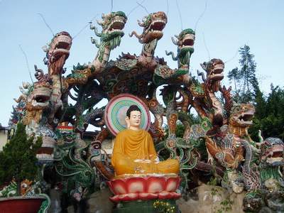 The street where my hotel was situated had the funny habit of sporadically disappearing off the face of the earth, and it never took me less than an hour to find it, but I did eventually get back and subsequently headed to the market for a collection of fake pork, beef, chicken and anchovies at one of the many vegetarian stalls. Dalat is one of those rare cities that is a few hundred kilometers from anywhere and happens to be next to a big hydroelectric plant; for this reason, the night sky is illuminated with dozens of neon signs and the skyline is dominated by a huge, glowing eiffel tower. From what I've seen of the nightlife so far, it seems to fall short of overwhelming; there is a lively shopping center where vendors scream out insanely low prices on piles of junk and great crowds of people rapidly shift from one to the next as they compete; since it is a college town, I'm sure the students are all going nuts somewhere, but, as usual, I didn't get invited to any crazy keggers.