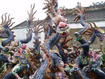 Hue (pronounced 'Hwey') is a pleasant river town full of history, tourists, and motorbike/cyclo taxis. It's also a dieter's hell, as some years back it was home to a guy who demanded every night that 50 dishes be prepared by 50 cooks, and as a result, the streets are teeming with tasty snacks that cost around a nickel a piece. On my first day there, I wandered around a dozen different pagodas, went to the war museum (which was ever-so-slightly biased against us), and went to the imperial palace, which may have merited its 55,000 dong admission price at one time in its history, but (thanks to those pesky Americans) was now mostly just one big pile of rubble. For dinner I went to a restaurant run by a deaf guy, which was flanked by two other restaurants run by deaf guys (it leads you to wonder just how many deaf restauranteers one neighborhood can have); using only sign language (actually, nothing's really new there) I ordered "roll-your-own" spring rolls which were essentially the oriental equivalent of fajitas; my spring rolls never looked even remotely like what you'd order at a restaurant and usually had to be eaten with a spoon, but they were tasty nonetheless.