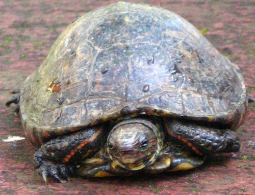 Crawling across Andie's pillow was the first wildlife we observed on our trip - it was a small mollusk that propelled itself by grappling with one of two tentacles that extended out either side of its shell. We flicked this aside and had a few semi-peaceful hours of sleep (not withstanding visits by many varieties of biting insects) before being awoken by the 5am rooster. Stepping outside of our room, I found a small turtle that was in the process of taking a crap on our doorstep; judging from its speed, this creature had spent all morning moving to this spot so that it could present us with this sign of welcome.