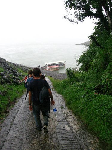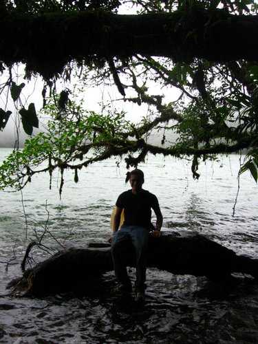 Luckily, the only critters we happened upon were a few dozen brown frogs and a bird that bore a close resemblance to an archaeopteryx. After reaching the top, we descended down a nearly vertical 100m path to the edge of the lake that had formed in the volcano's crater. Rising again to the rim, we soon realized that there was no signage to indicate what path we should take next and the map supplied to us pointed down a dead-end. After following two trails that dropped to the water's edge, we found another that led away from the crater and down into the surrounding jungle. After hiking for half an hour along this path, we ran across a sign that read simply "Lodge"; we had no idea what lodge it was talking about, but it seemed less likely that we would die in the jungle.