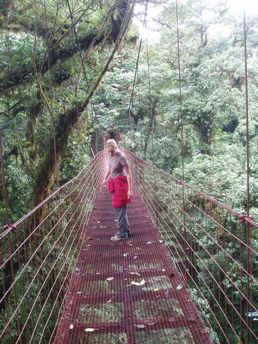 We hiked for about twenty minutes before returning to buy our tickets - the gate keeper was a bit perplexed by our arriving on the wrong side, but did not raise any objections. We paid an exorbitant fare for two breakfast casados with a tourist allotment of toast and jam to accompany the typical beans and eggs. I took one look at the prices of the bottled water and concluded that Costa Rican tap water was now safe for me to drink. We hiked through another 10km of rainforest and spotted what I have decided was one of the exceptionally rare and beautiful quetzals that inhabit that area. At the end of the trail was a viewpoint where, on a clear day, you could supposedly see both the Gulf and Pacific coasts; this was not a clear day. On the southern side of the loop, we spotted a very colorful species of pigeon. Later, we walked through the canopy on a suspension bridge which extended across a small ravine; a sign suggested that only 10 people should occupy this bridge at any one time, so I decided that we should wait and see how many tourists we could get on the thing simultaneously, but this game grew old quick and we were soon hiking the last kilometer to the park exit.