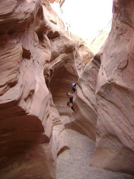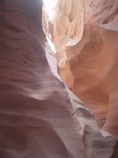 Canyoneering in Utah's slot canyons was another central focus of the trip that was compressed into one day due to weather and climbing. What was left of the original slate was an 8-mile loop through Little Wild Horse and Bell canyons. The trail started with massive walls divided by a wide channel of gravel and sand; this was quite exhausting to trudge through but was soon replaced by a narrow, winding slot that allowed for plenty of fun chimneying, scrambling, and all manner of acrobatics. After an hour or two of this, we returned to another wide channel. What we would soon discover was that we really hadn't covered that much ground while in the slots, and that hiking on sand through the open desert, even if it's only for a few miles, can be atrociously difficult and dangerous. Around the halfway point, Scott became convinced that he was dying of heatstroke and malnutrition and could likely go no further; this was rather inconvenient at the time because the thunderstorm that was fast approaching us could easily spell disaster as we returned through the narrows of Bell Canyon. We saw to it that he was properly fed and watered, and quickly pushed on through the rest of the trail, returning to the car before the first drops fell.